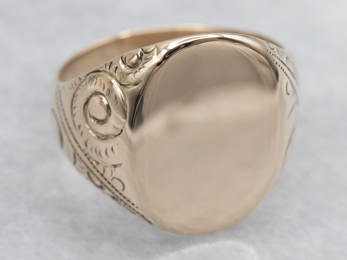 This distinguished signet ring showcases a refined oval face complemented by elegantly scrolled shoulder details, embodying the hallmarks of antique craftsmanship. The classical design combines timeless sophistication with meticulous artistry, making it an exceptional choice for those who appreciate heritage jewelry. Perfect for personal wear or as a meaningful heirloom piece.