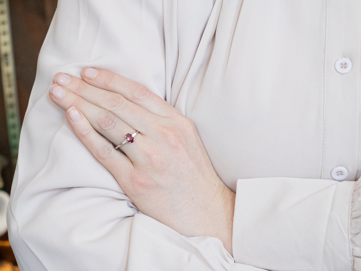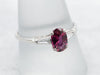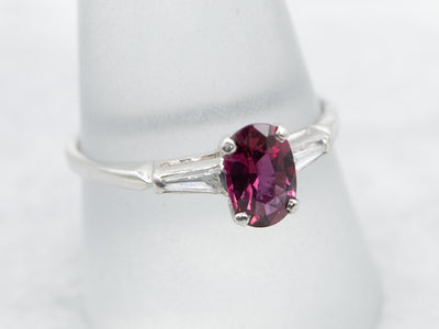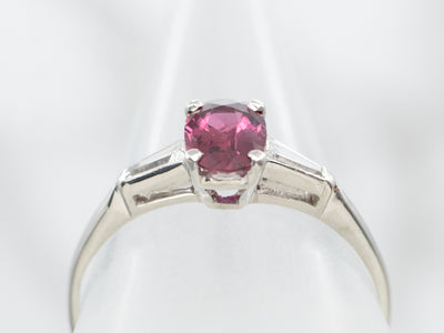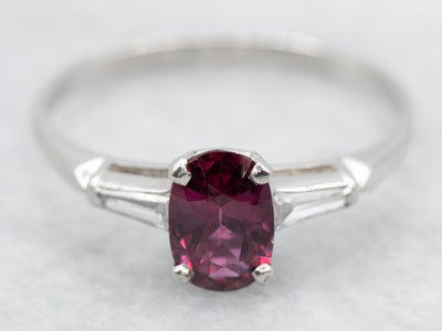 This platinum, baguette-cut diamond mounting came to us missing a center stone. Instead of a diamond, we chose to set it with a fine, deeply saturated raspberry-red ruby. The combination of the brilliant white metal, the sparkling diamonds, and the luscious ruby create a wonderful, timeless piece!