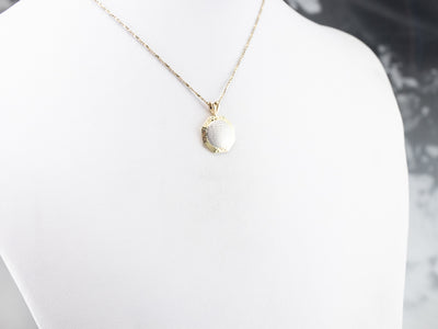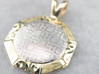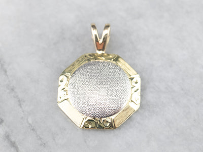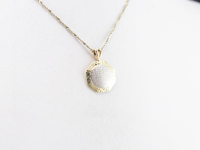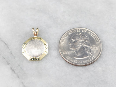 We've transformed an antique cufflink into a one-of-a-kind pendant! This piece has a beautiful texture that gives the platinum a soft finish, contrasting with the bright shine of the 14 karat gold. This is a great pendant to layer with other pieces!
