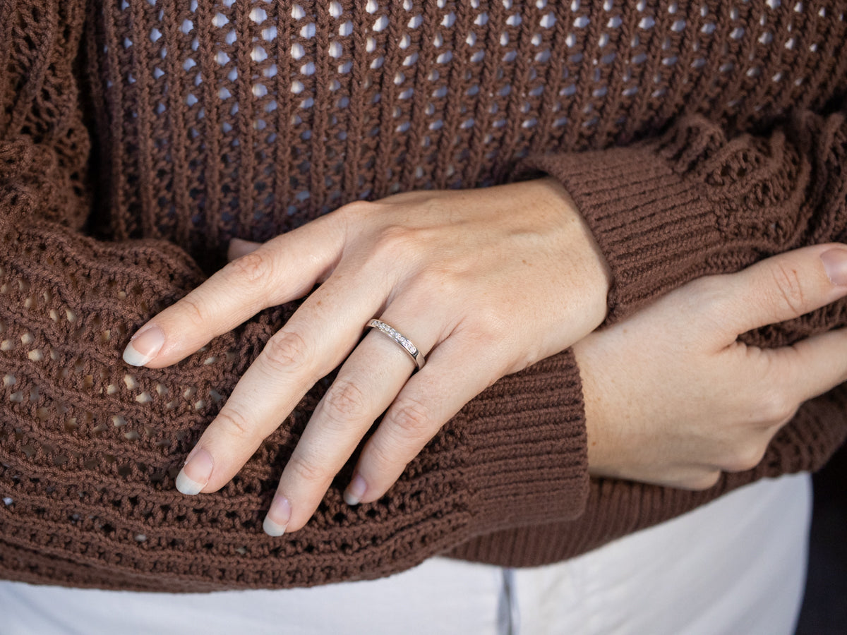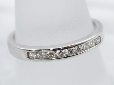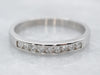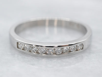 We love channel settings because they protect the gems while also letting light flow through them! This wedding band features diamonds of exceptional color and clarity, creating a row of intense sparkle within the polished white gold.