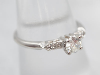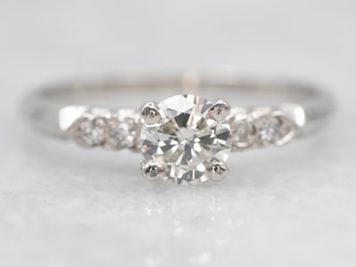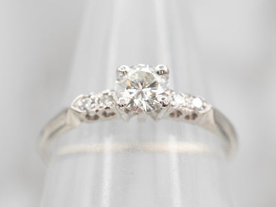 Classic diamond engagement ring set in platinum! The center-round brilliant diamond is set with four protective prongs and is accented by pretty diamonds on the shoulders of the ring. A classic in style and high in quality, this would be a great piece for a lady looking for a timeless ring to wear with a variety of bands!