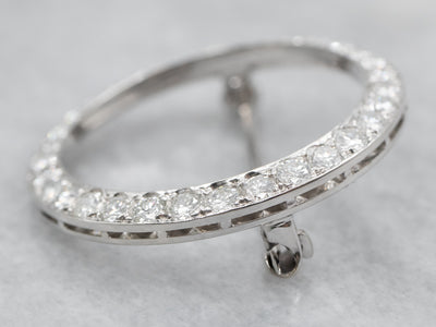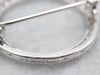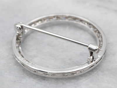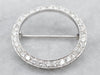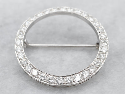 This vintage circle pin, sometimes called a sweetheart brooch, is crafted of polished platinum and set with fine sparkling diamonds. Classic in size and style this lovely piece is ready to wear or gift!