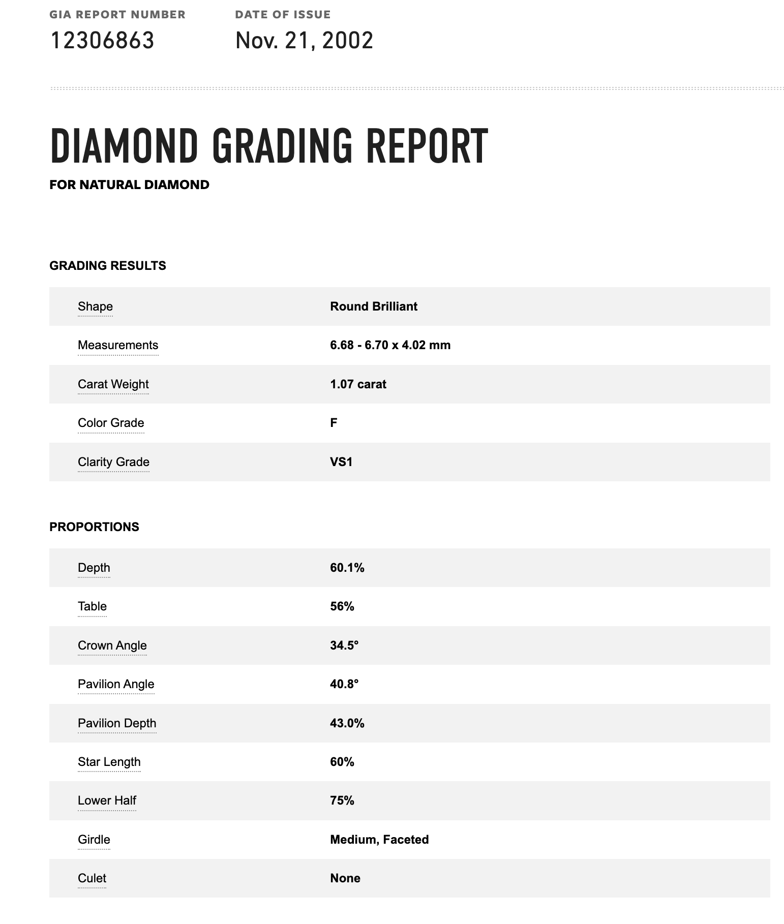 Metal: Platinum Gem: Diamond 1.07 Carats, VS1 in Clarity, F in Color Gem Measurements: 6.7 mm, Round Ring Size: 6.50 Marks: "10% IRID" Stamped on the inside band GIA Report Number: 123********