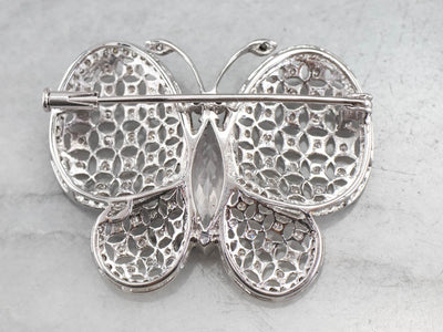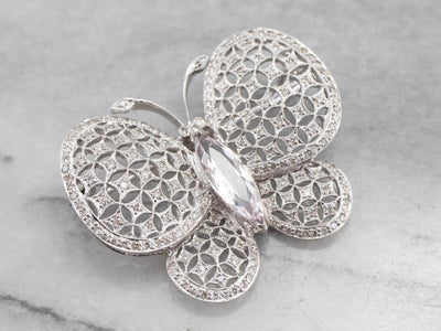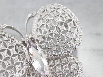 This is a stunning vintage brooch, crafted with high-quality materials that the butterfly appears to move as the light flows over its morganite body and glittering diamond wings crafted in highly polished platinum. This is an elegant brooch, a perfect signature piece, ready to wear or gift.