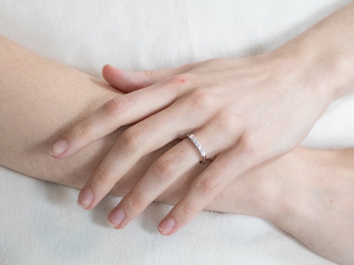 This lovely platinum diamond band is sparkly and stunning! The prong-set diamonds create an understated, but classic appearance, the band tapers gently, making it comfortable to wear on the finger. Furthermore, the shape of the band matches up well against a variety of engagement rings.