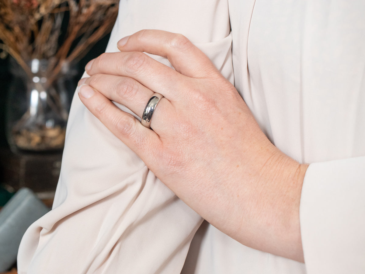 Simple and easy to wear, this low dome band is solid, weighty platinum. The quality of the manufacture is excellent, all we've done is polish it up and make it pretty!