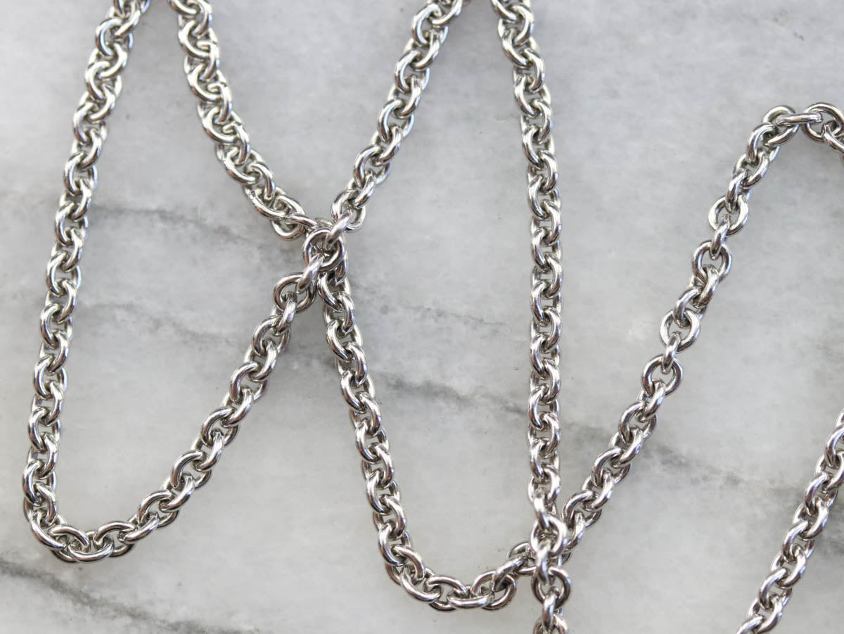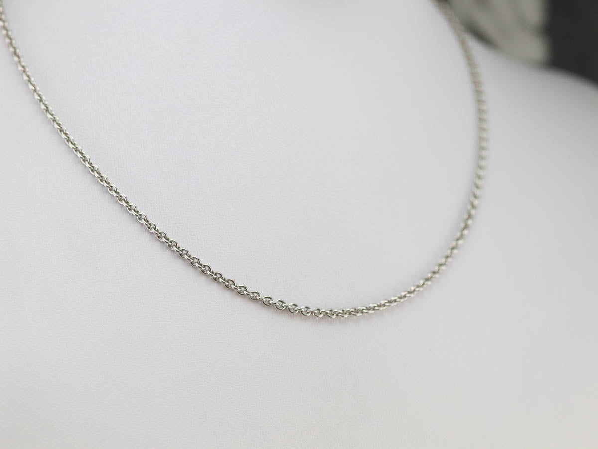 This polished platinum rolo chain is made up of small round links, a classic style that brings balance to the length of the chain. Ready to wear alone or with a pendant, this is a great piece for layering!