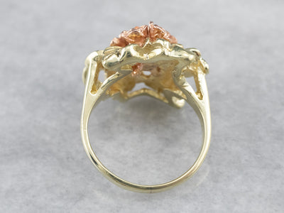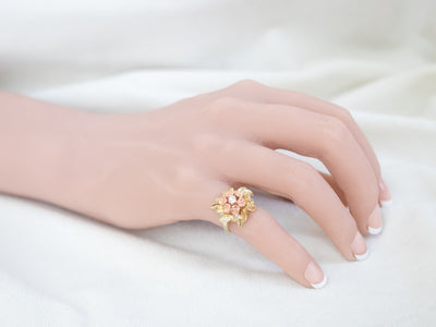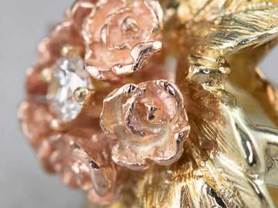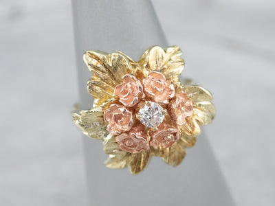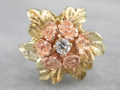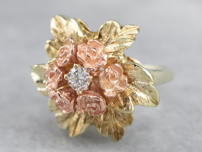This pretty ring was crafted by the mid-century, with 14 karat gold in leaves and roses of rose gold forming a sweet bouquet center. This pretty piece has a stunning round brilliant diamond, a sparkling contrast to the softly textured petals of the flower.
