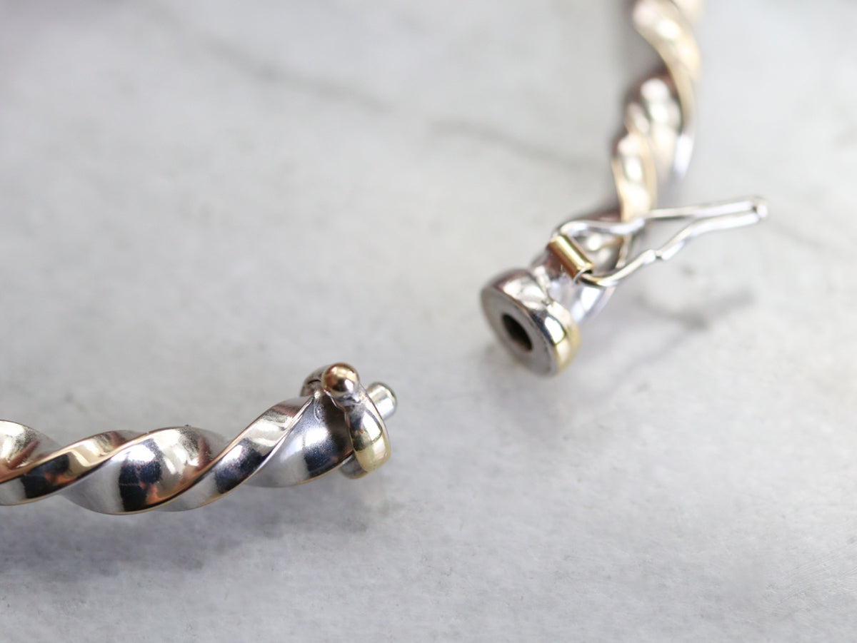 This beautiful hinged ribbon twist bracelet has a classic look with modern lines! This is hollow but created with thick, solid walls; creating a bangle that is both substantial and comfortable. Crafted of bright white gold and accented by yellow gold, this will perch delicately on the wrist and can easily be stacked with other bangles!