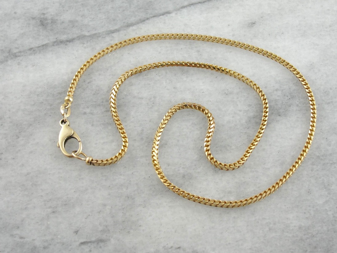 This snake chain is certainly substantial enough to wear alone, but will also be easy to wear with a pendant. Crafted of rich yellow gold, this snake chain has a braided look on the surface, giving it a great play of light on the skin.
