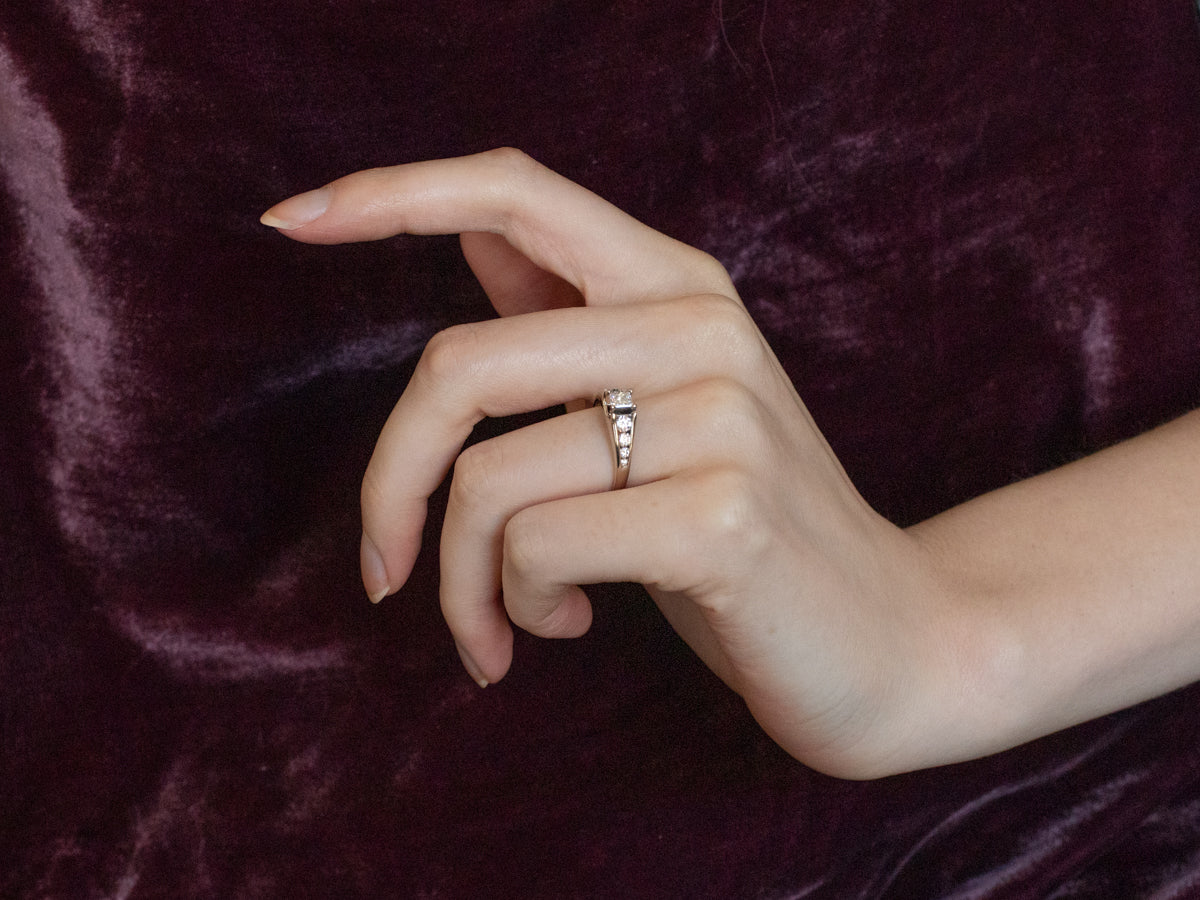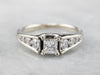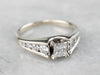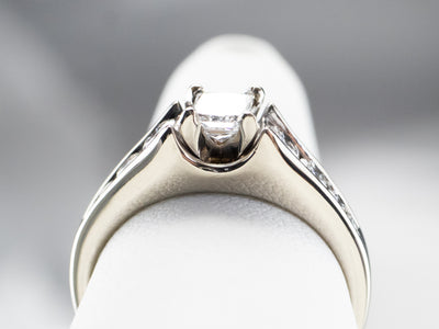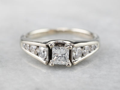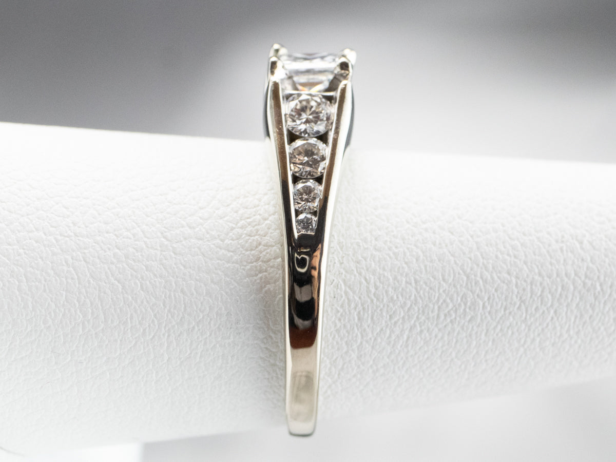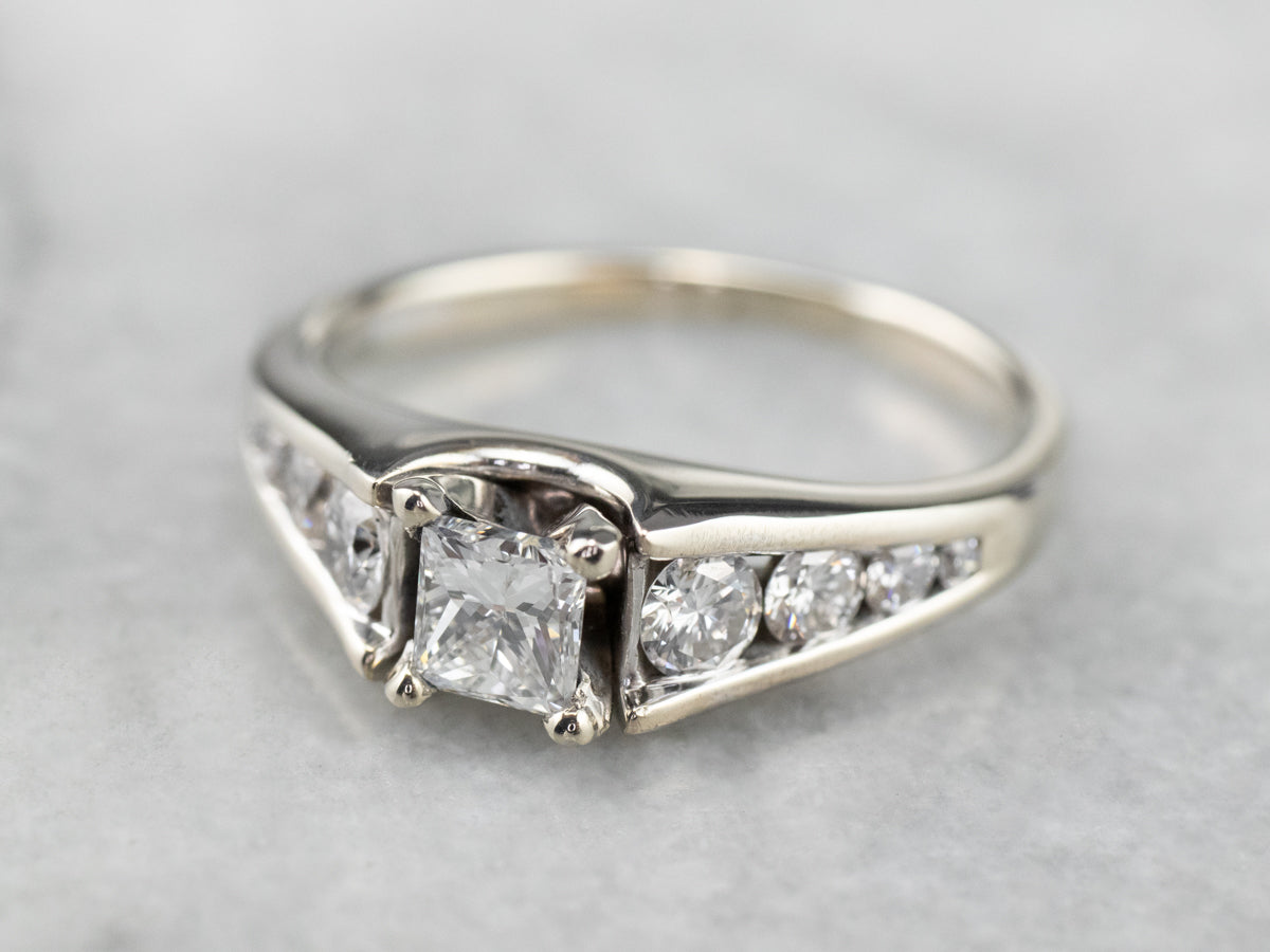 Absolutely timeless, this white gold engagement ring features a classic profile on the hand, with perfectly balanced shoulders channel set with bright diamonds. The center stone is gorgeous, a princess cut diamond, framed beautifully by the picture corner prongs!
