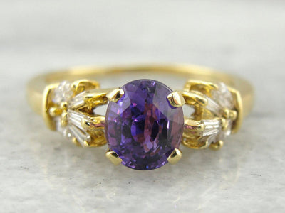 A simple starburst of light frames this beautiful Purple Ceylon Sapphire. The starburst is created with diamonds, both marquise, and baguette cut, radiating from the sides of the center stone. The sapphire is from Sri Lanka, the source of the finest sapphires in the world. The color is a rich plum with astounding sparkle!