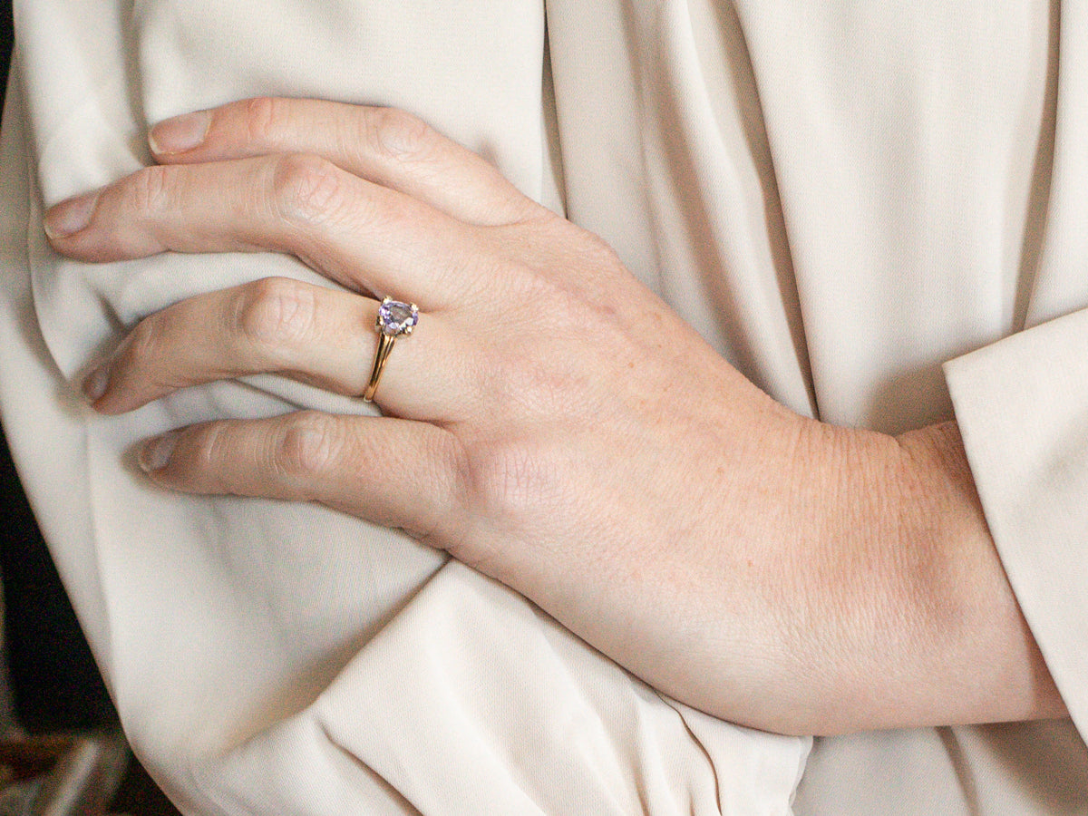 Shake up your style with this ring. The oval cut purple sapphire is set in both yellow and white gold, giving it a unique look. Make a statement with this solitaire ring!