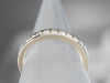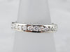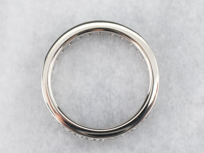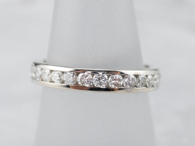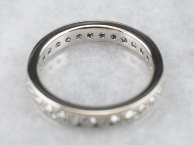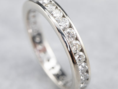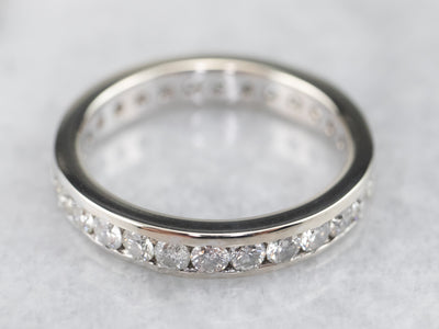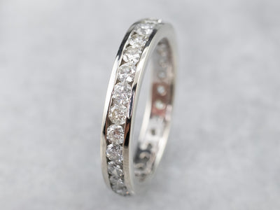 This white gold band is channel set with diamonds, all the way around! A continuous circle without breaking, this style of wedding ring is called an 'eternity' band. Simple to wear, these can spin and play on the finger without ever appearing upside down. Pretty alone, this white gold band would look well stacked with other rings.