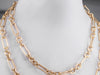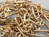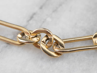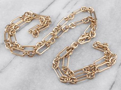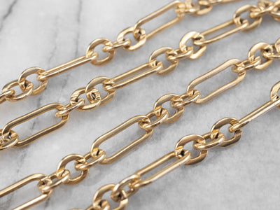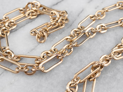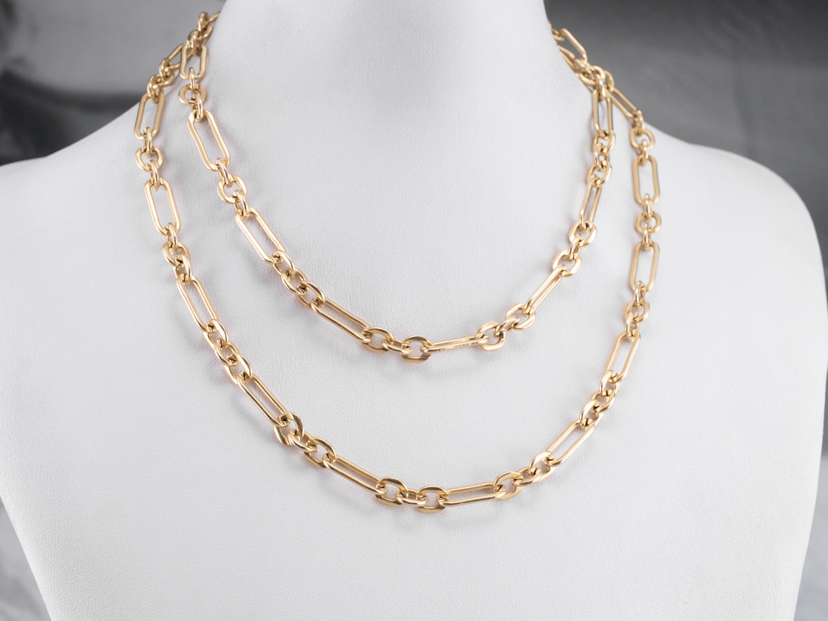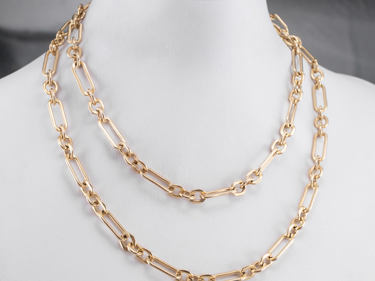 This long vintage gold paperclip chain is stunning, an elongated oval link chain with a soft patina. The craftsmanship is superb, creating a strong, well-made chain from which a watch or pendants can easily be hung.