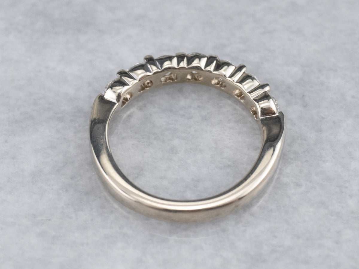 This is a classic wedding band made impressive by the quality of its materials! Crafted of 18 karat white gold, this ring has a bright polish that pairs perfectly with the exceptional diamonds set into it. When worn, this band displays a full row of intense, light-filled sparkle.