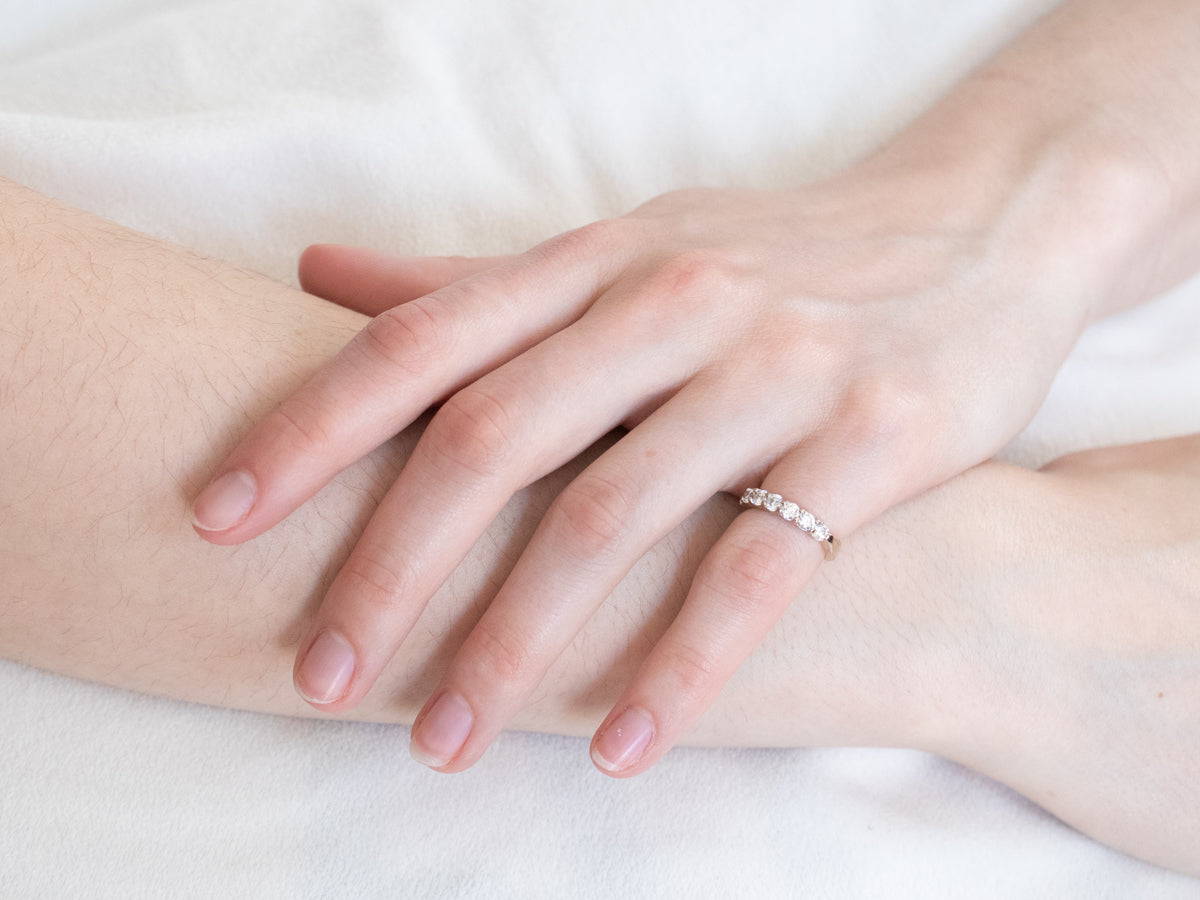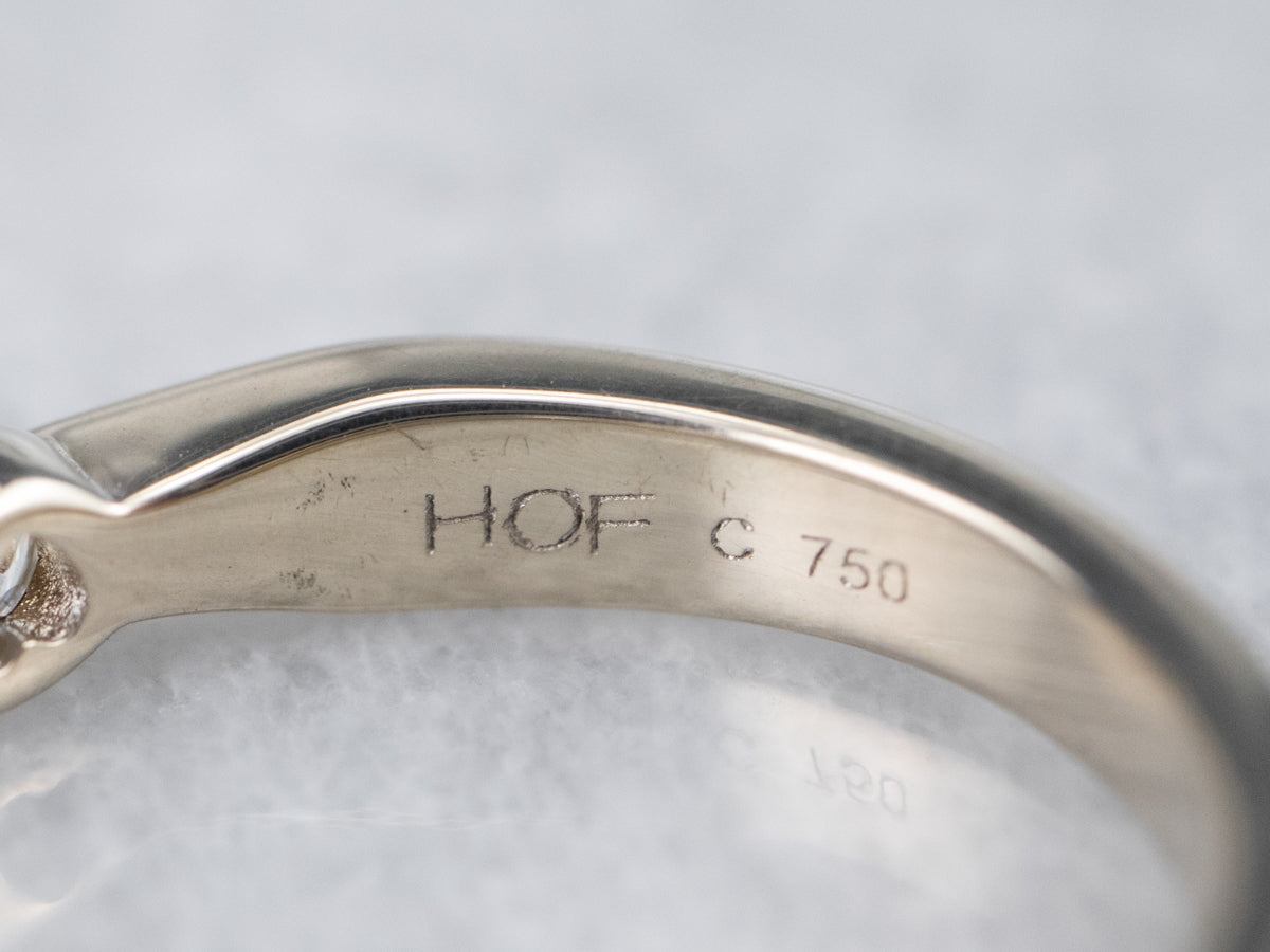 Metal: 18K White Gold Gem: 7 Diamonds totaling .84 Carats, G in Color, SI1 in Clarity Width of Band: 3.2 mm Height off Finger: 2.5 mm Ring Size: 4.25 Marks: "HOF c 750" Stamped on the inside band