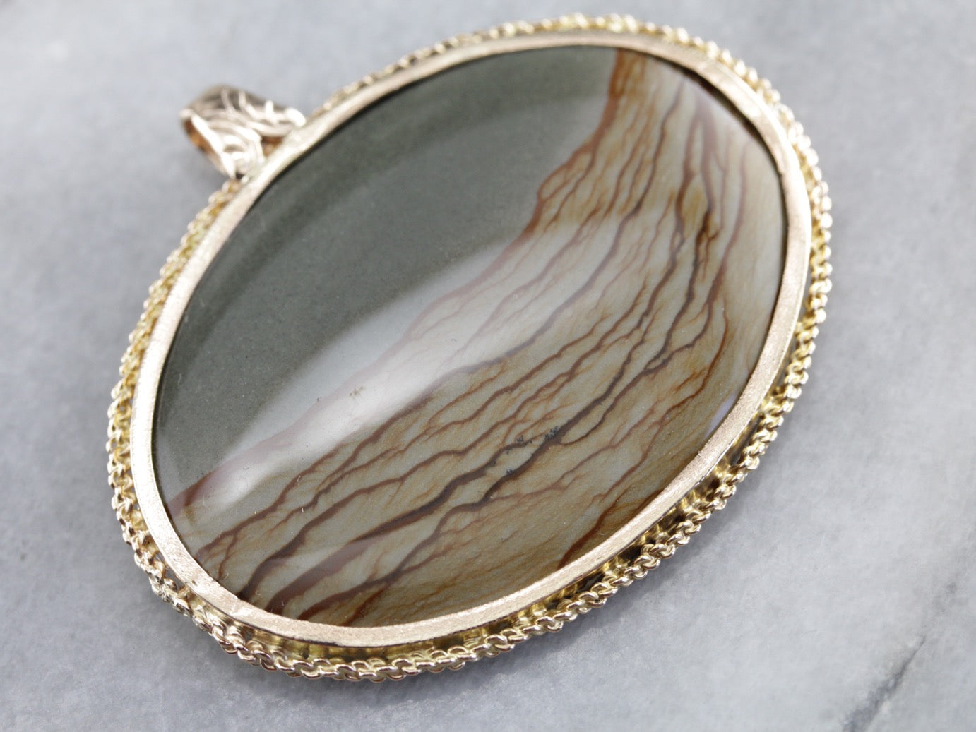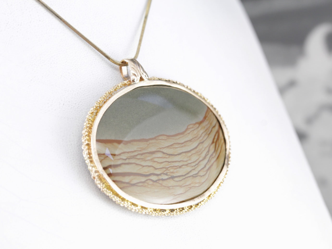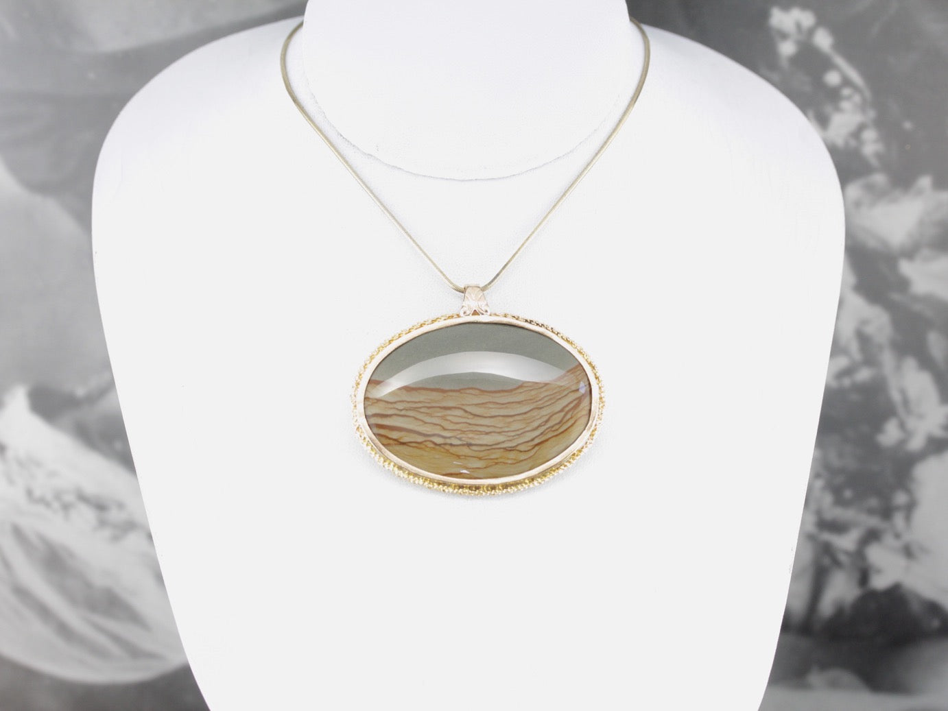 Soft desert tones in shades of chocolate, dove gray and warm champagne, layer this pretty gemstone pendant. Cut to best display the landscape within, this amazing rare Owyhee Jasper makes a bold statement and will pair well with simple jewelry with clean lines.