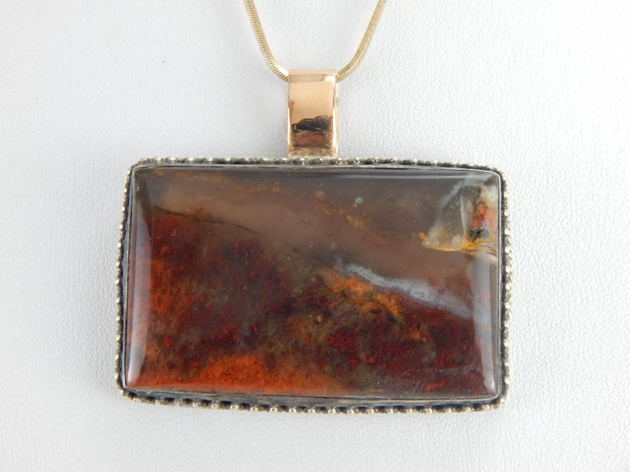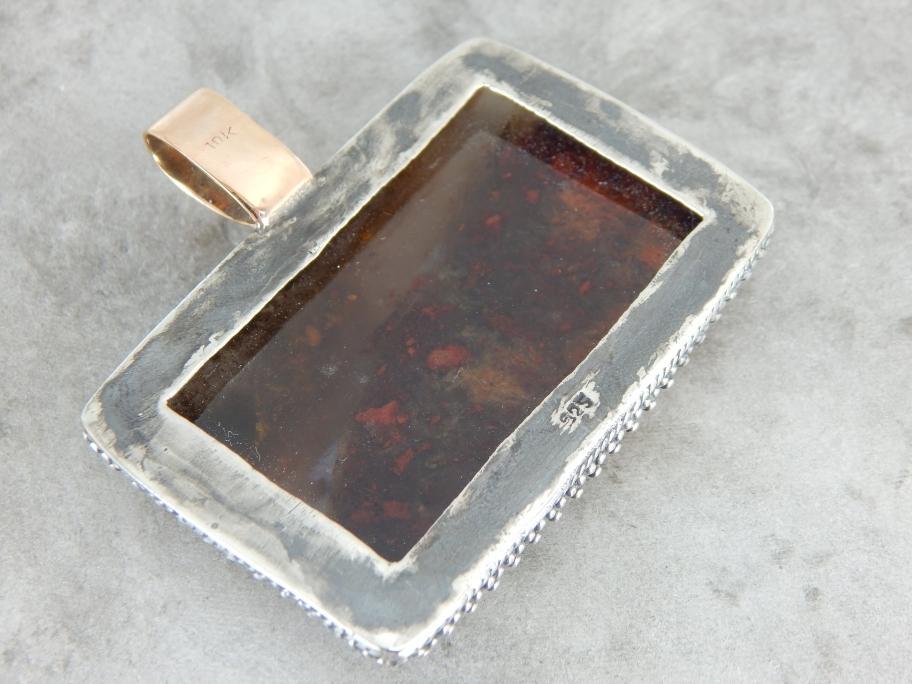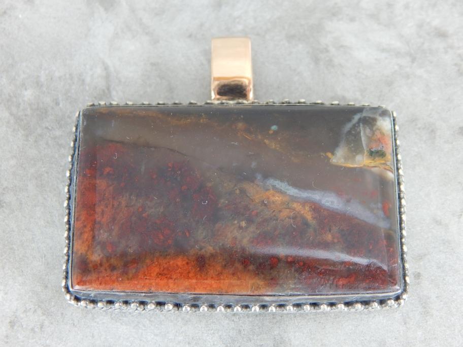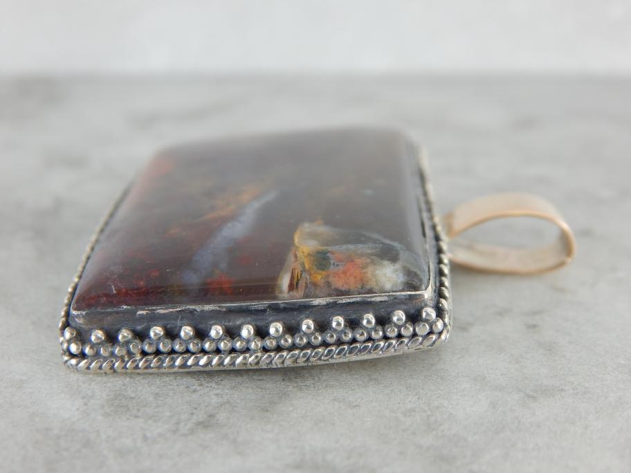 We set this vintage silver pendant with a beautiful piece of jasper in rich russet shades. White quartz matrix and red dendritic inclusions create the image of a galaxy in the night sky. Completely unique, this American jasper is sure to be an eye catcher and conversation starter.