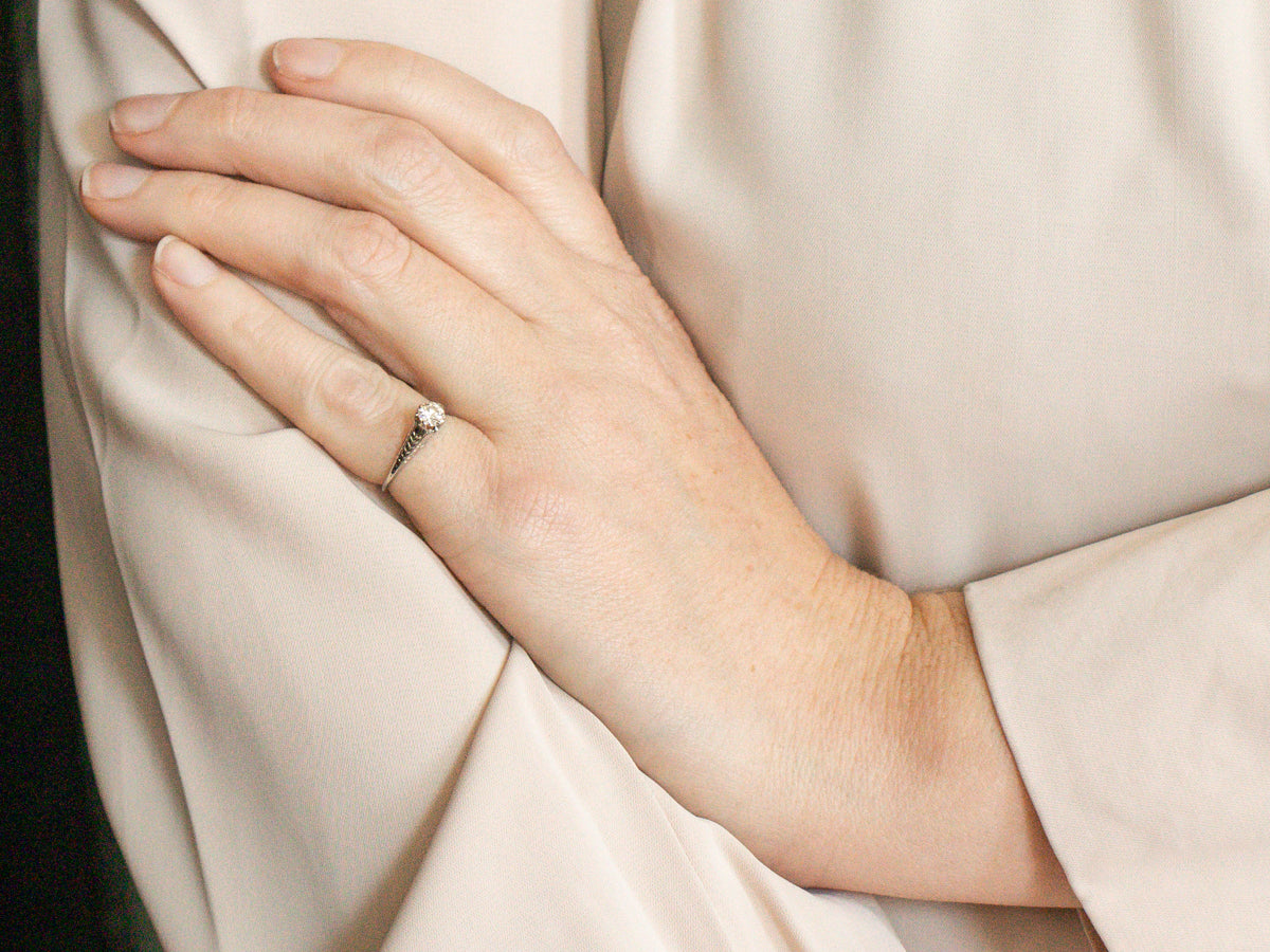 This stunning ring is the perfect way to symbolize your special bond. Crafted in white gold, this ring features an Art Deco design and a striking European cut diamond, creating a timeless and luxurious look.