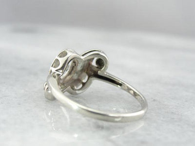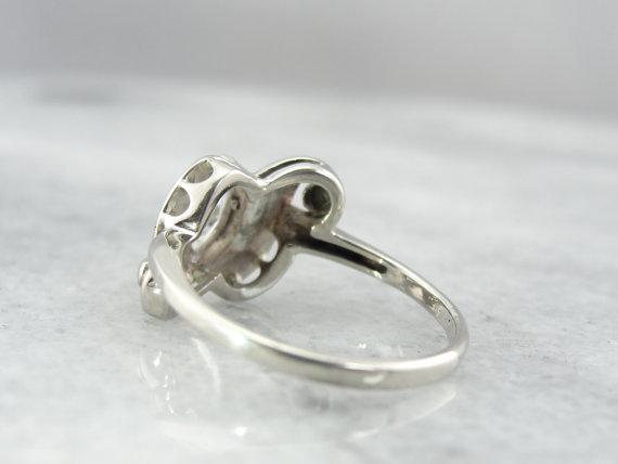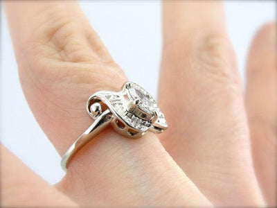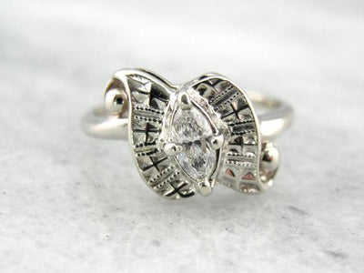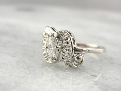 We've set this Retro white gold mounting with a pretty marquise cut diamond! This is a sparkly stone, full of light and life. The wing-shaped mounting lets plenty of glitter shine through the stone from underneath, as well as providing a strong and secure mounting for the stone.