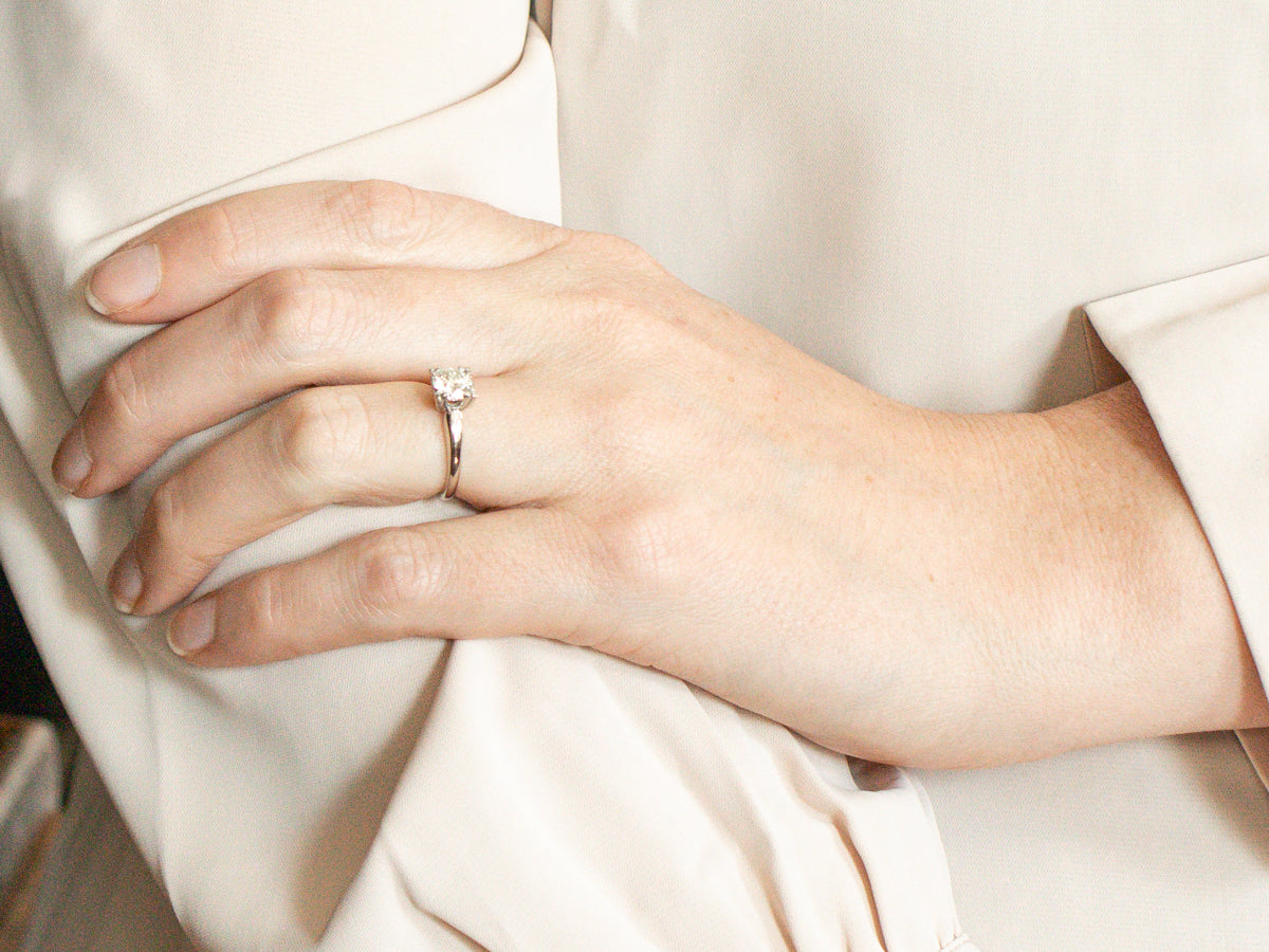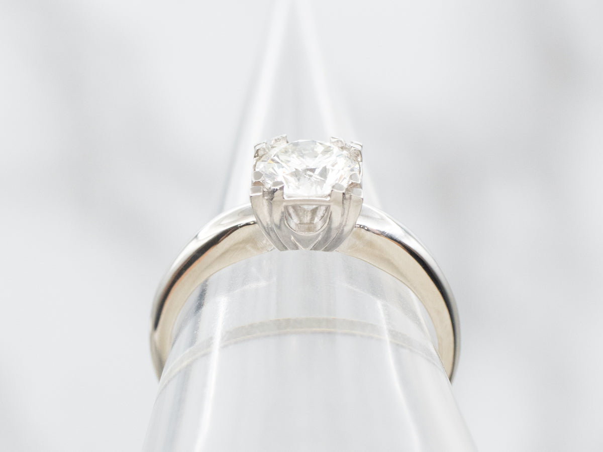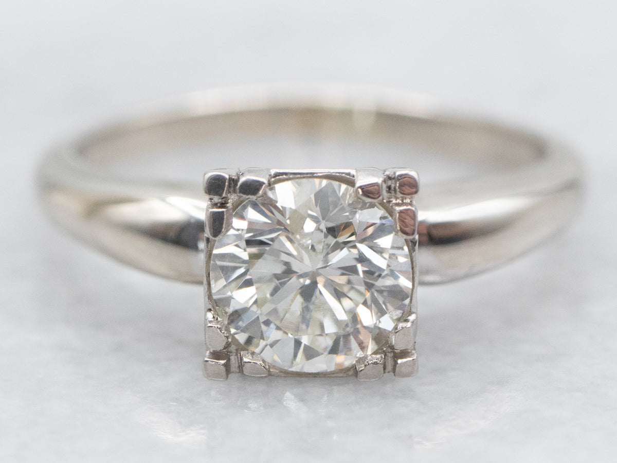 Tapered shoulders bring light and gleam to this vintage, retro-era engagement ring. Crafted of bright white 14-karat gold, this classic solitaire will match up well with a variety of wedding bands. The diamond has excellent clarity, a clean, bright stone with plenty of glow!