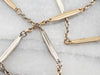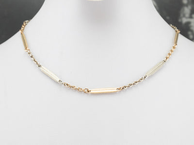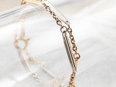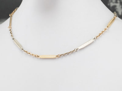 This vintage yellow and white gold watch chain features textured elongated bars and small, well-balanced chain links. With a simple polish and classic design, this is ready to wear or give as a gift, it also would make a lovely component for a custom necklace or bracelet as well.