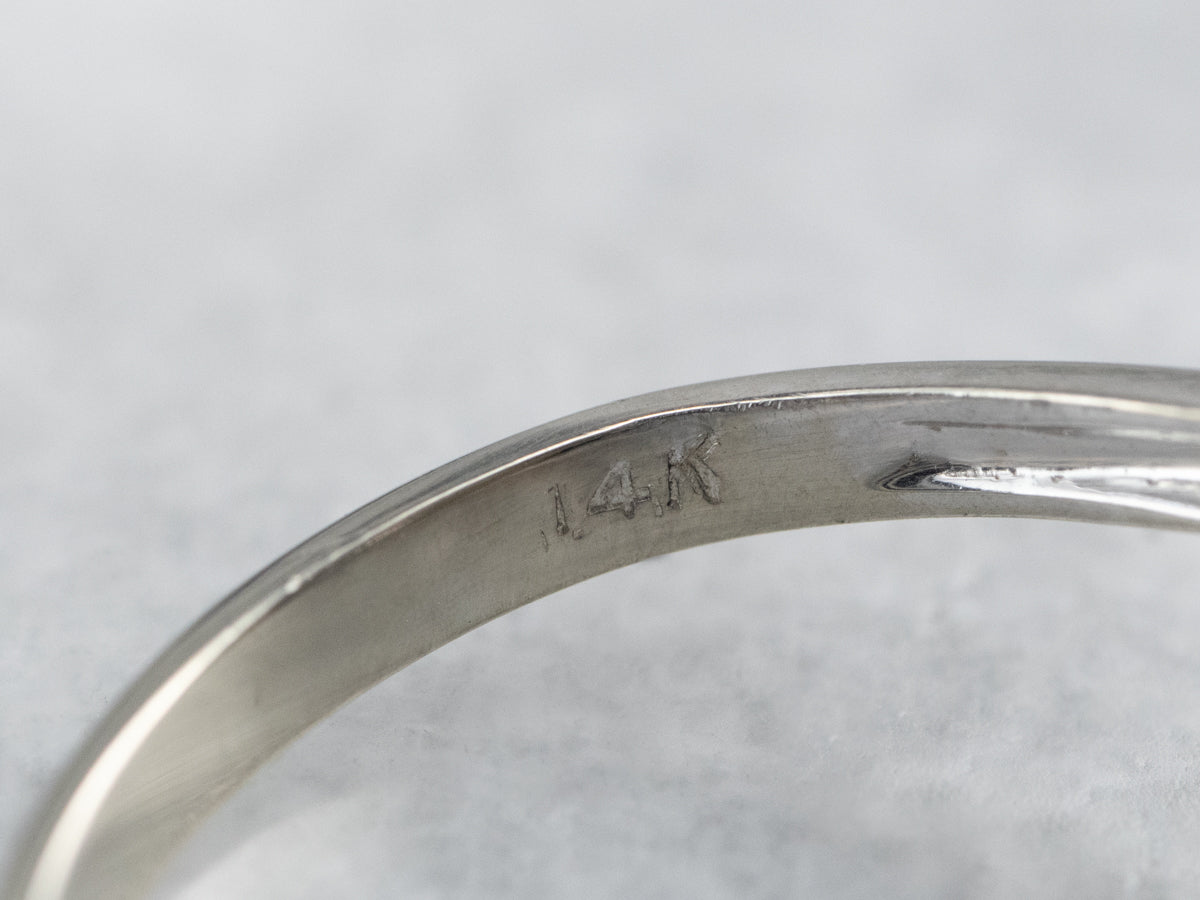 This lovely early retro-era white gold diamond-studded ring can be worn a variety of ways: as a stunning engagement ring, a birthstone ring, or as a cocktail ring that transitions from day to night. We've set this simple mounting with a navy blue spine!