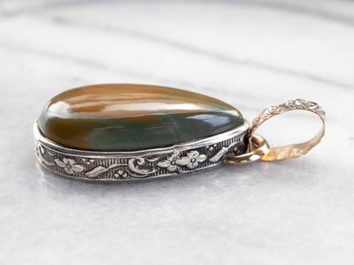 This is a gorgeous sterling silver piece with a lovely piece of jasper! This stone is filled with rich chocolate and teal tones, set within a wide sterling silver floral frame that compliments the beauty of the stone. We have also set this pendant with an antique Victorian cigar band as a bail, making this a truly one of a kind special piece!