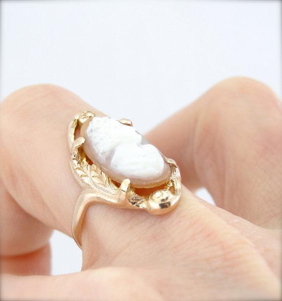 This sweet Carved Shell cameo has a lovely warm rose color and silky look, set into a long, pink gold Art Nouveau era mounting. Romantic and substantial, this cameo ring is easy to transition from day to evening. Beautiful rosettes and detailed lines complete the antique look!