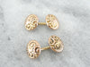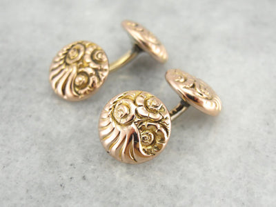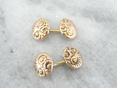 These Victorian era cufflinks are the very definition of sophistication. The soft rose gold discs radiate with a warm and inviting luster. These are decorated with a sweeping Cornucopia Motif in a stylized pattern with wonderful detail.