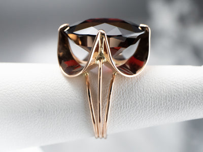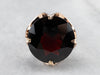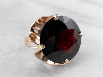 This garnet cocktail ring is bold and fabulous! The garnet is beautifully displayed in a Belcher style setting that holds it high and proud. The dark crimson tones of the gem pair wonderfully with the warmth of the 14 karat rose gold setting, which shines with a terrific polish.