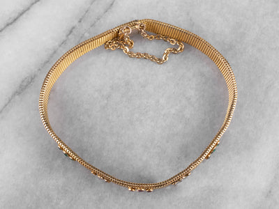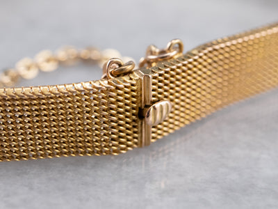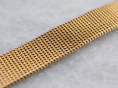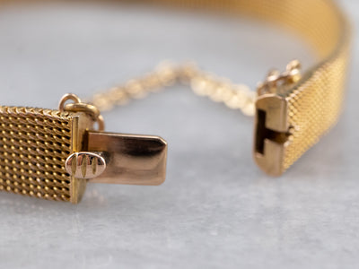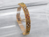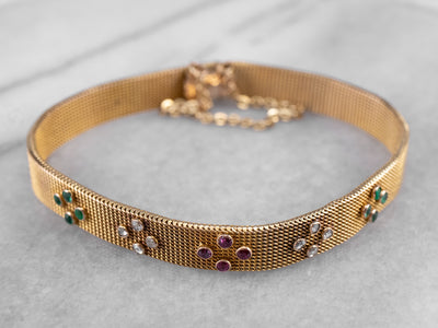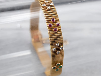 This elegant bracelet has the look and feel of a mesh chain and is so refined! Clusters of different colored gemstones, rubies, diamonds, and emeralds, dot the 14 karat gold and add little pops of color.