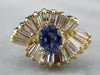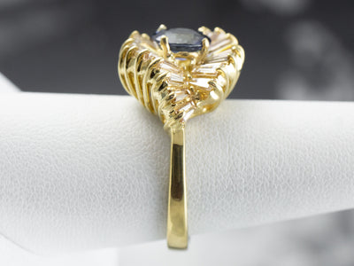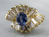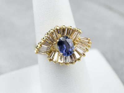 This sapphire ring is a unique twist on a classic design! The stunning sapphire is set in the center of a halo of baguette-cut diamonds, drawing one's eye into this high-quality gemstone. The large and glittering diamond halo is broken up with curving 18 karat gold accents, adding fabulous dimension, movement, and artful styling!