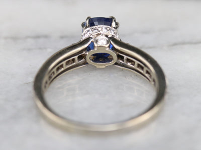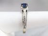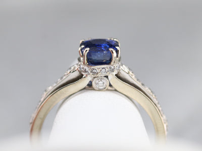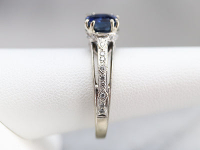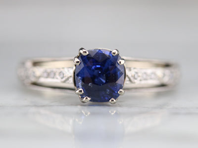 This sapphire ring would make an incredible engagement piece for the lady who loves this classic combination! In the center, a glittering deep blue, cushion-cut sapphire sits, accented by geometric motifs of sparkling diamonds, the top of the ring sits raised, so that a wedding band could nestle perfectly next to the band. The shoulders are also are set with pave set diamonds, which makes this ring special and sparkly.