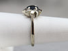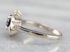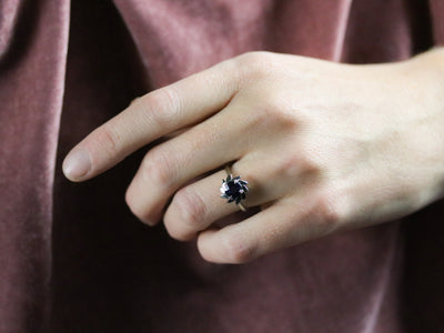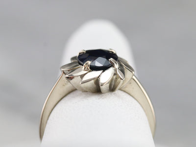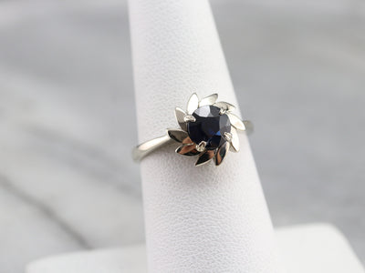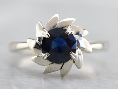 This sapphire ring is classic with a twist! The traditional combination of white gold and navy blue sapphire is pure elegance. The spiral petal like frame around the gem adds a touch of whimsy and femininity that makes this ring utterly charming!