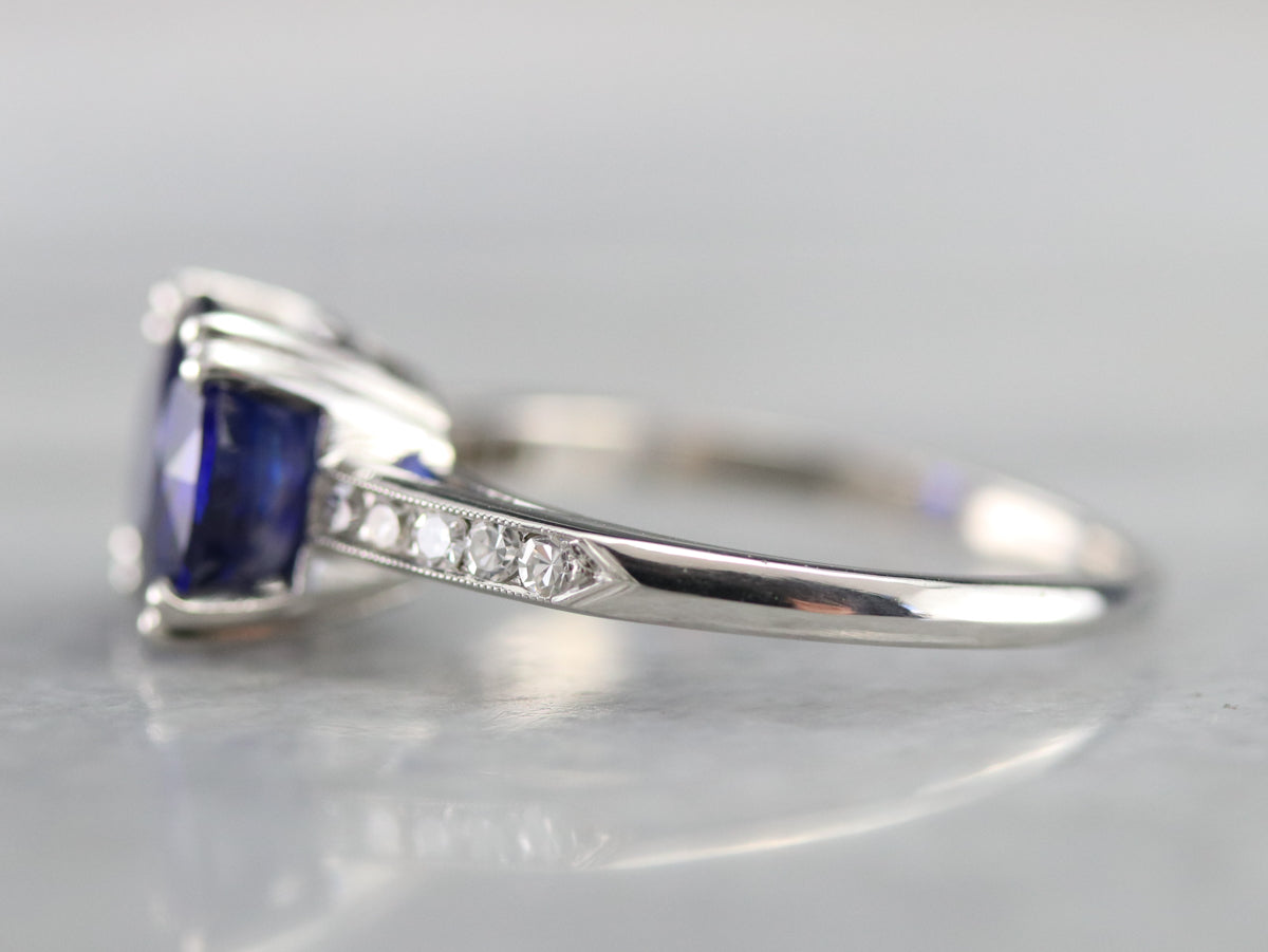 This sapphire and diamond engagement ring is classic, yet impressive. The sapphire is a deep and vibrant ultramarine blue in a stunning round cut. Glittering diamonds adorn the shoulders, bordered by a fine milgrain finish. Crafted of sturdy platinum, this ring is sure to attract envy!