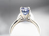 Solitaire engagement rings such as this one will never go out of style! We've set this classic mounting with a deep periwinkle blue sapphire, whose subtle hues and sophisticated sparkle are beautifully complemented by the cool tones of the 14 karat white gold. Versatile and timeless, this ring is perfect for everyday wear.