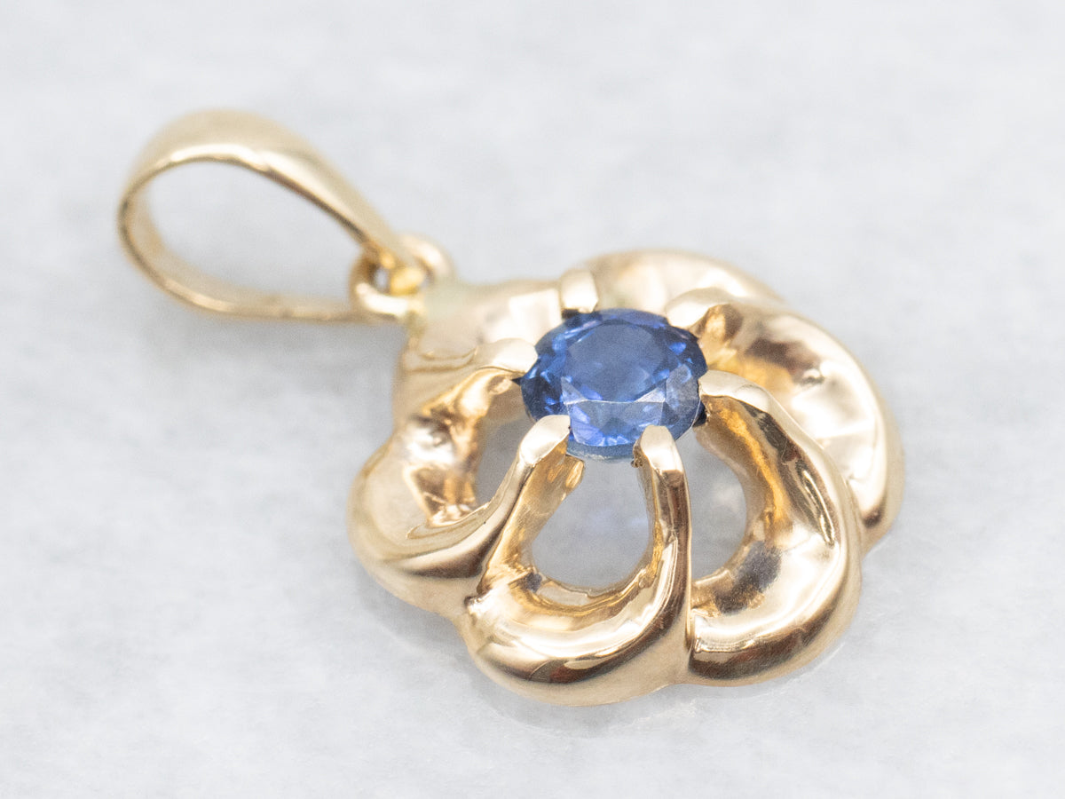 This is a pretty piece, the spiraling looping yellow gold forms a lovely wreath around a bright newly set sapphire gemstone center!