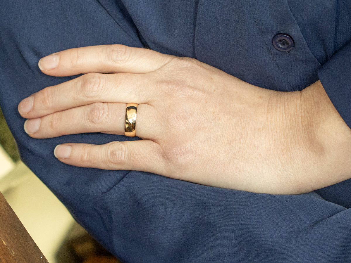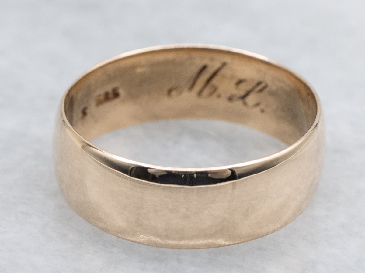 Metal: 14K Yellow Gold Width of Band: 6.6 mm Height off Finger: 1.1 mm Ring Size: 7.75 Marks: "ML 585" Stamped on the inside band