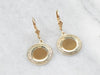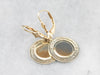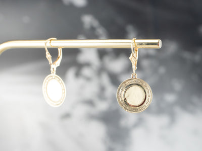 These beautiful earrings were handcrafted by our studio, using pieces of antique cufflinks! The handsome, sophisticated disc are crafted of polished gold and dates to the early 1950s! We've created bails and hung them on smooth, undecorated wires of 14K yellow gold.