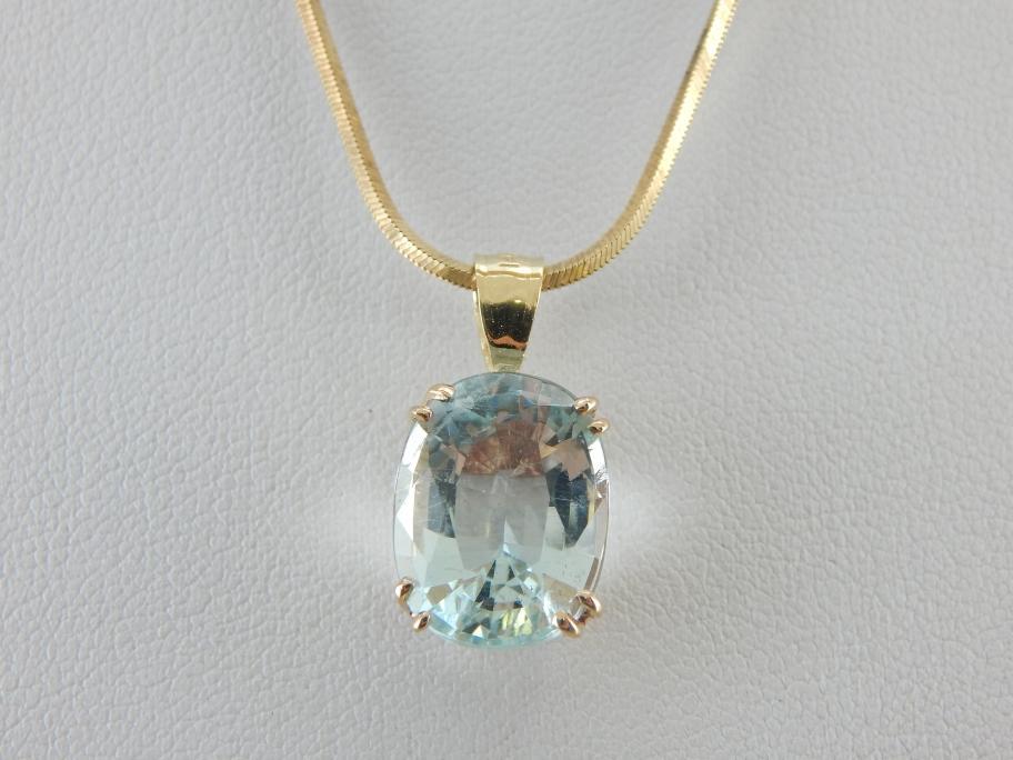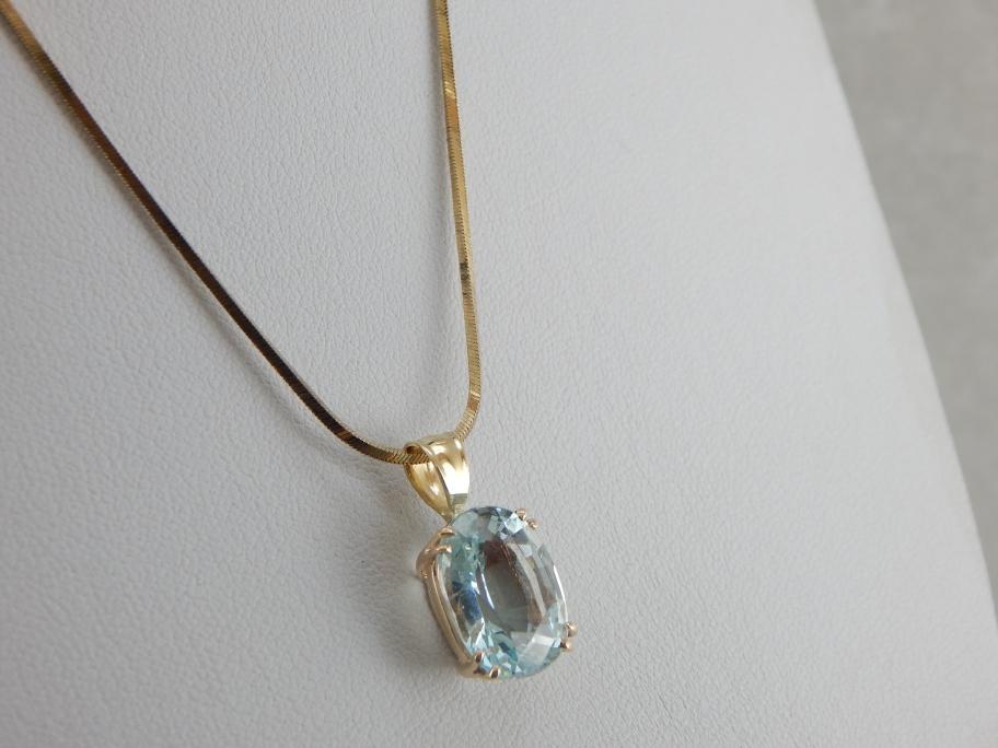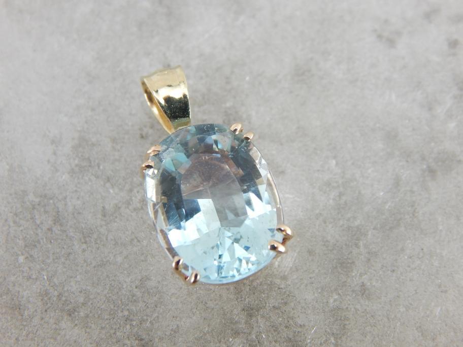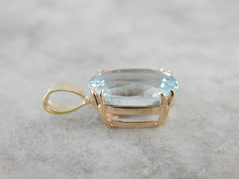 This brilliant ice-blue aquamarine captures light beautifully! The precise double prongs hold the stone in place and also allow plenty of light to illuminate the stone. The bale is wide enough to allow a good range of chains of various sizes. This pendant can be both dressed up and dressed down and is a perfect gift for any occasion!