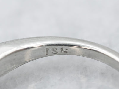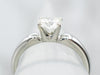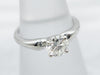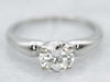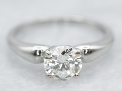 A stunning and chic engagement ring! This solitaire engagement ring features a simple, well-balanced white 18-karat gold band, topped with a four-round prong head. The lovely diamond at the center is a bright, pretty stone weighing .72 carats and is filled with plenty of sparkles, fire, and flash!