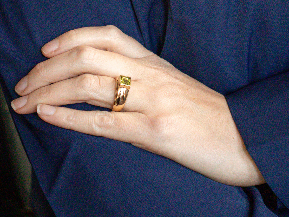 This classically designed peridot solitaire ring is timeless and goes with everything! This simple and elegant ring features a warm yellow gold mounting. The peridot is a rich lime green, beautifully protected in the sleek bezel setting.