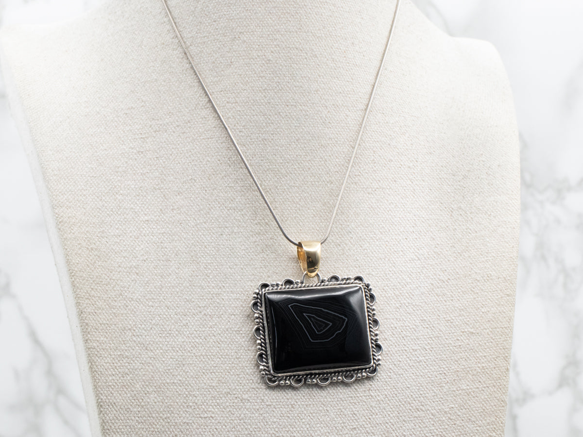 This pendant is expertly crafted with sterling silver, with a yellow gold bail. The rectangular banded onyx creates a unique and striking look, while the twisted frame adds a touch of elegance. Enhance any outfit with this stunning pendant!