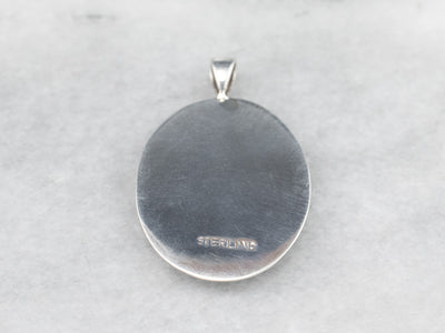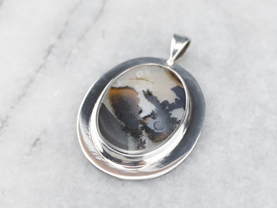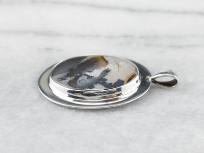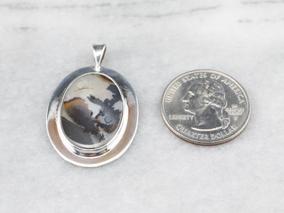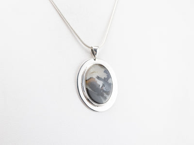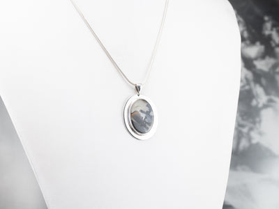 Stunning and ghostly, this is a gorgeous piece of dendritic agate! The stone is a unique white and black-hued agate that has a cool translucent look with a lot of depth. Absolutely breathtaking, this minimalist oval sterling silver pendant is perfect to gift!