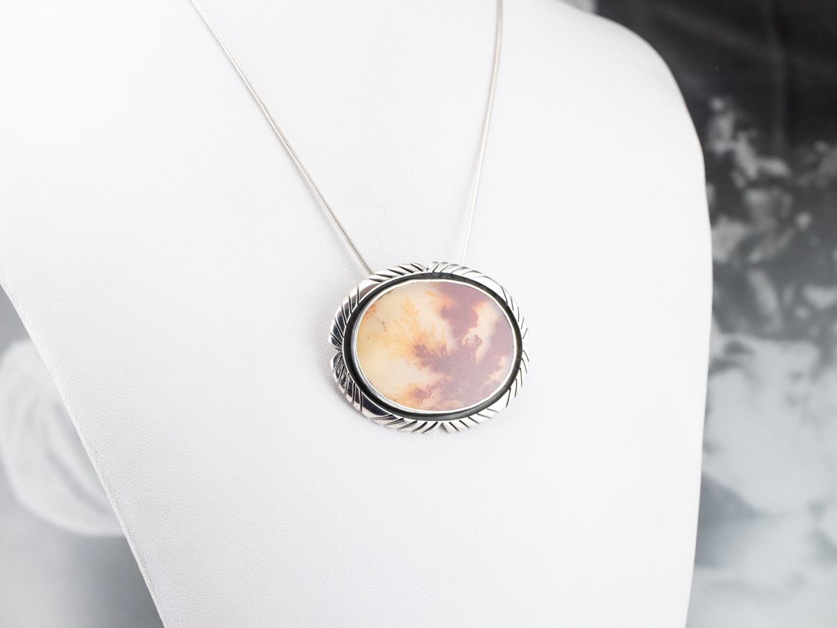 The dendritic quartz at the center of this vintage brooch or pendant is a firey confection of organic shapes, a beautiful oval of buttercream, burnt umbers, and orange hues. The sterling silver bezel set frame features tribal linear style cutouts, creating a simple yet bold motif!