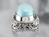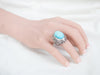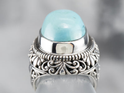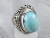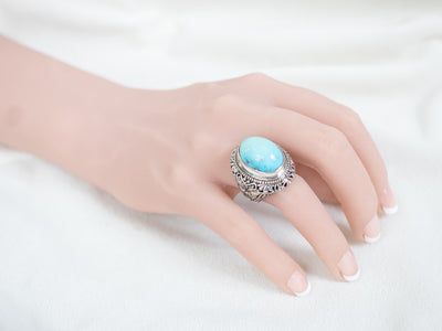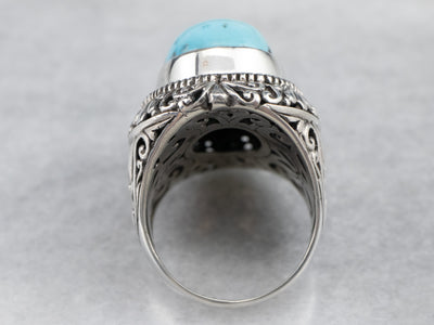 This turquoise statement ring is high impact! A beautiful robin's egg blue, this generous size stone is set into a bezel floral setting of sterling silver. This ring is the perfect way to add a bold pop of color to your look!