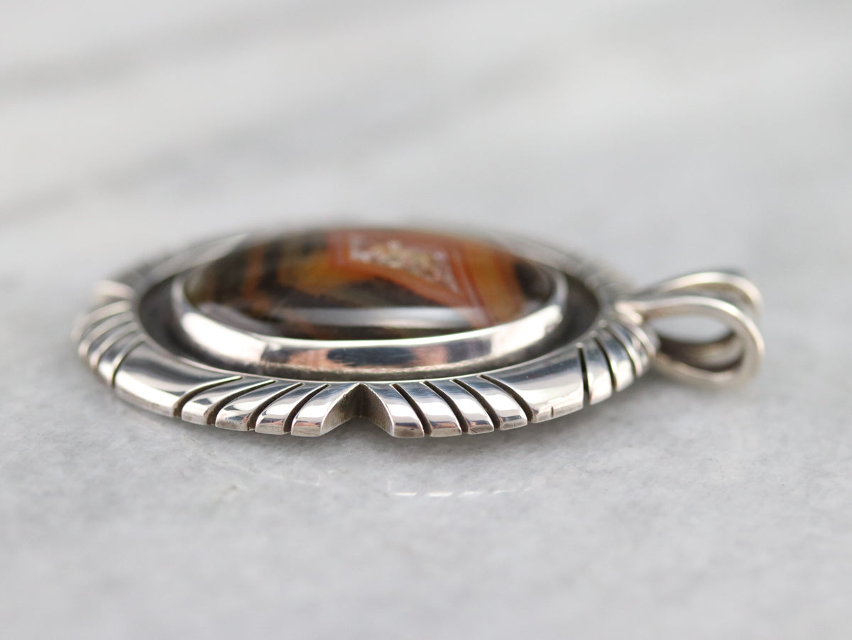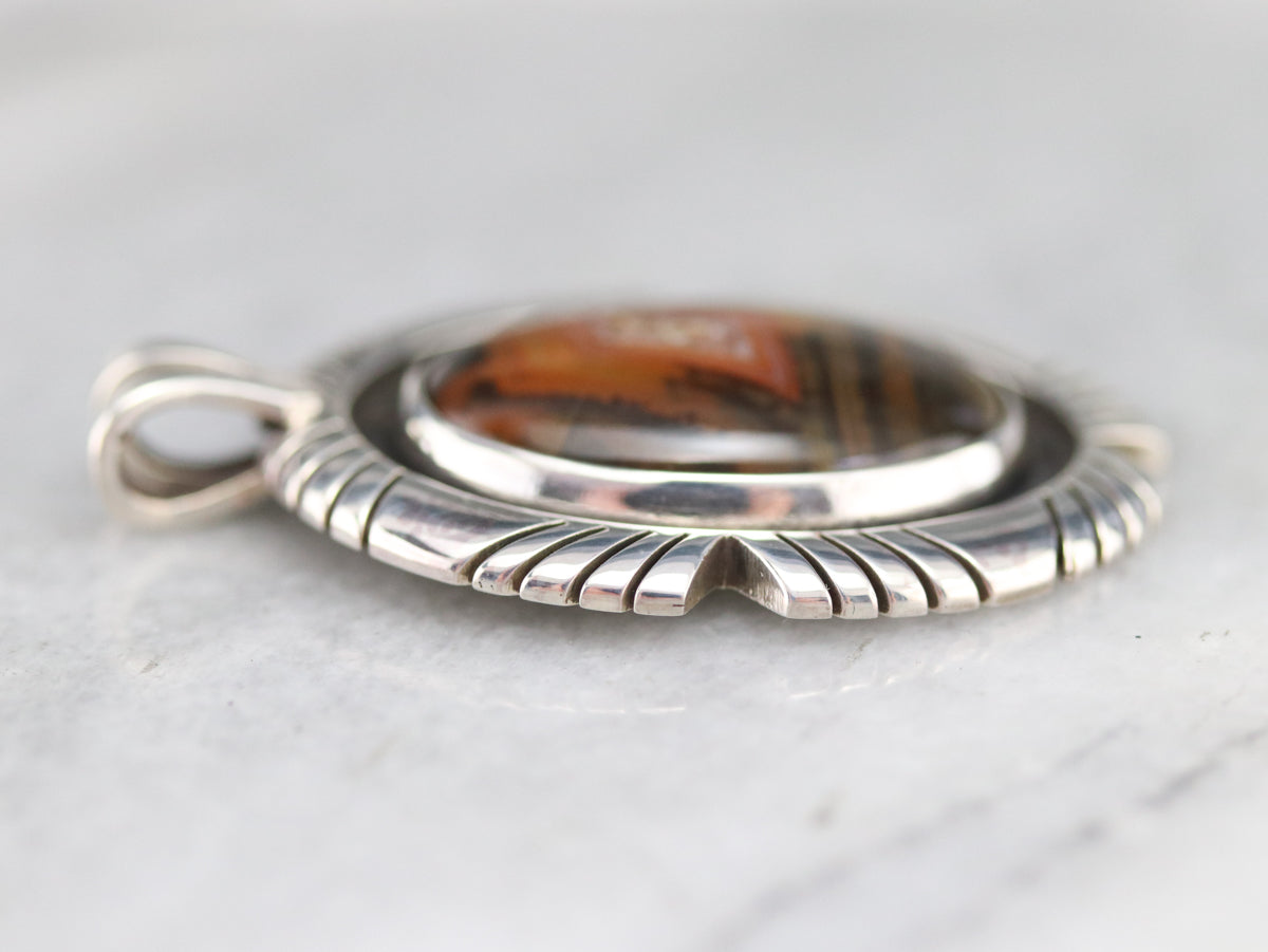 A jasper druzy quartz cabochon in earthy shades has been handset into the center of this handsome sterling silver pendant. The framework has a south/west style too, a great unisex piece, large enough to make a statement but still modest enough for everyday wear!
