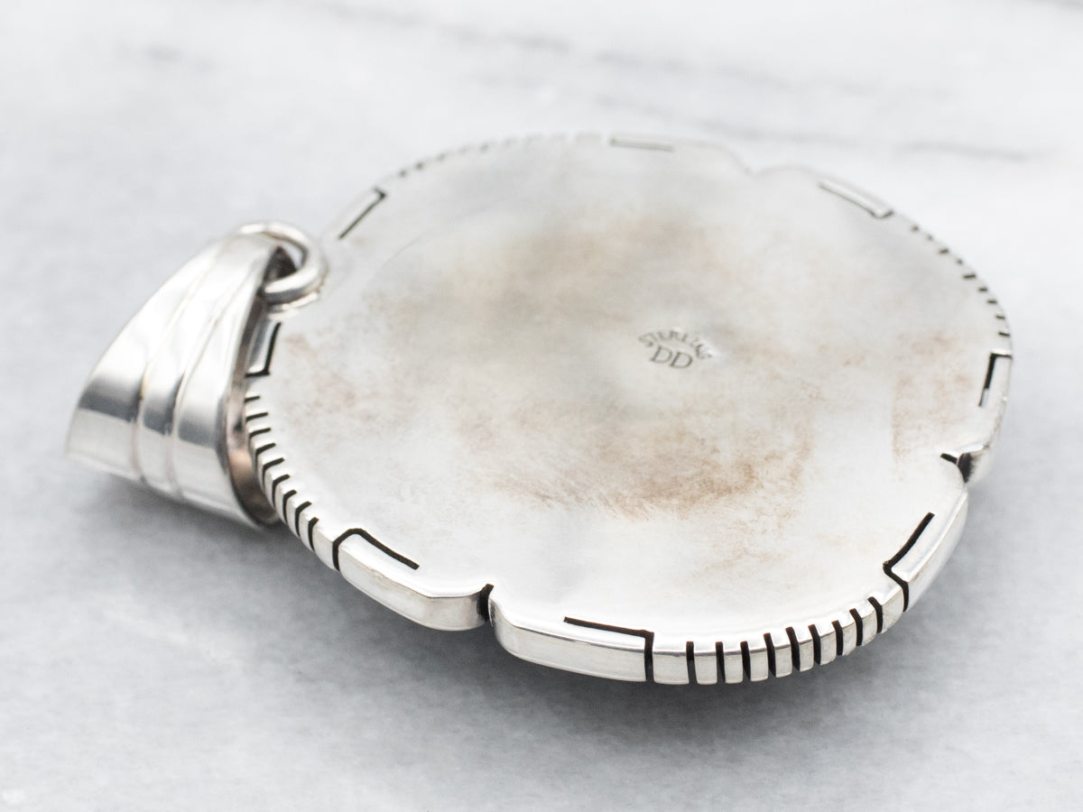Metal: Sterling Silver Gem: Turquoise, Natural Shape Measurements: 42 x 59 mm, with bail Marks: "STERLING DD" Stamped on the reverse